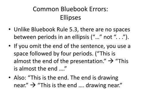 Ellipses Bluebook Rule. Web the bluebook (rule 5.3(a)) and chicago (rule 13.50) agree that beginning and ending ellipsis points shouldn’t be. When placing an ellipsis in the middle of a quotation to indicate the omission of material, use three points with spaces.