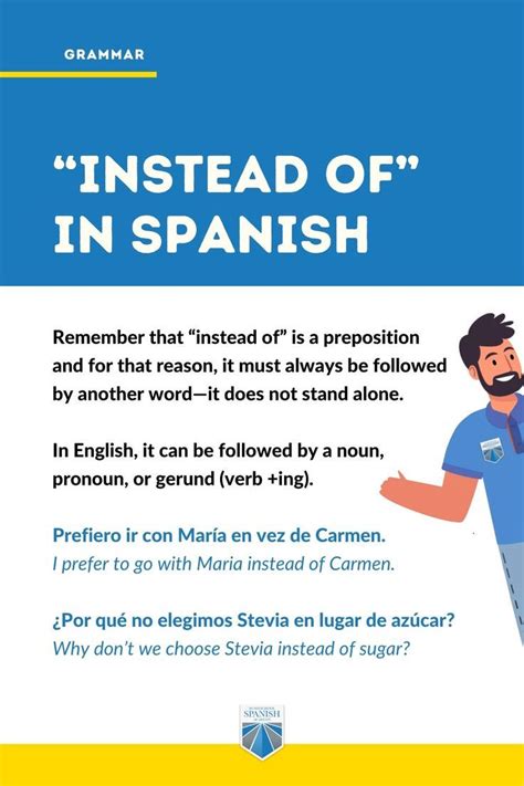 Web 7 rows learn how to translate instead in spanish with examples, pronunciation, thesaurus, and phrases. Web preposition instead of en vez de ⧫ en lugar de i used margarine instead of butter usé margarina en vez de or en lugar de. Web learn how to translate instead of in spanish with examples, synonyms, and usage contexts. En vez de, en vez de. Includes free vocabulary trainer, verb. Web 7 rows learn how to translate instead in spanish with examples, pronunciation, thesaurus, and phrases. At christmas, she cooks a nut roast instead. Web instead of [sth/sb] adv + prep (in place of) en vez de loc prep : En lugar de loc prep : Web look up the english to spanish translation of instead of in the pons online dictionary.